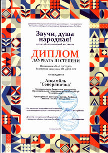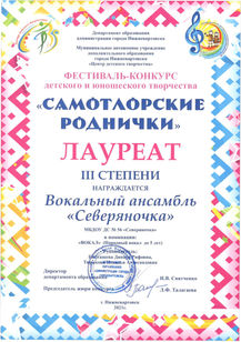Фестиваль детского и юношеского творчества «Самотлорские роднички» Диплом лауреата степени, творческий коллектив «Веселые нотки» в номинации «Эстрадный вокал» 2015г.