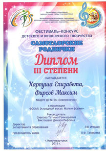 Центр национальных культур. Фестиваль детского творчества «Созвездие талантов» В номинации «Вокал» Диплом 3 степени. 2016 год.